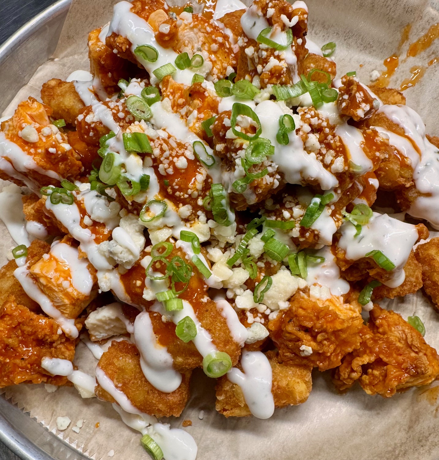 golden fried tater tots topped with buffalo chicken, crumbled bleu cheese, ranch dressing and green onions