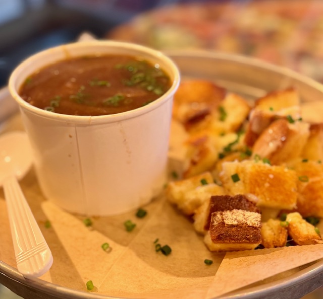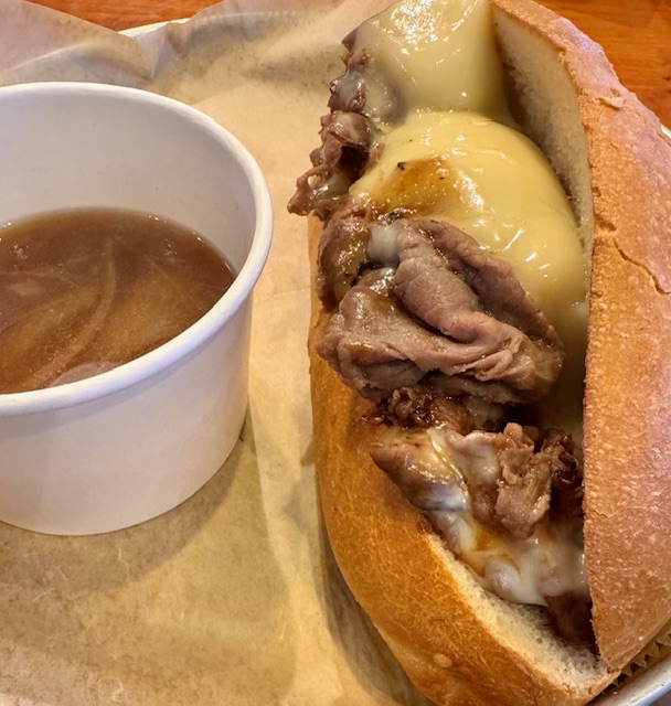 Boar's Head roast beef dipped in au jus, melted fontina cheese, horseradish cream on a crusty roll with French onion au jus for dipping