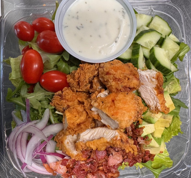 tender crispy chicken, bacon, avocado, tomato, cucumbers over mixed greens with ranch dressing