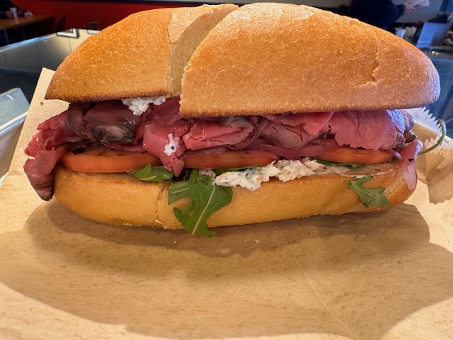 roast beef, everything cream cheese spread, arugula, tomato, pickled red onions on a toasted sourdough rollvvvv
